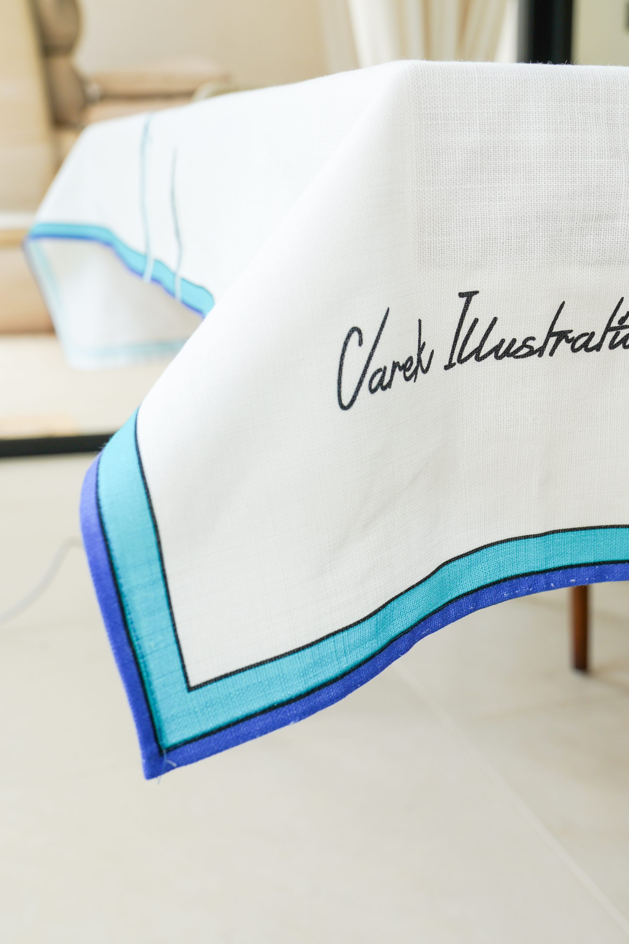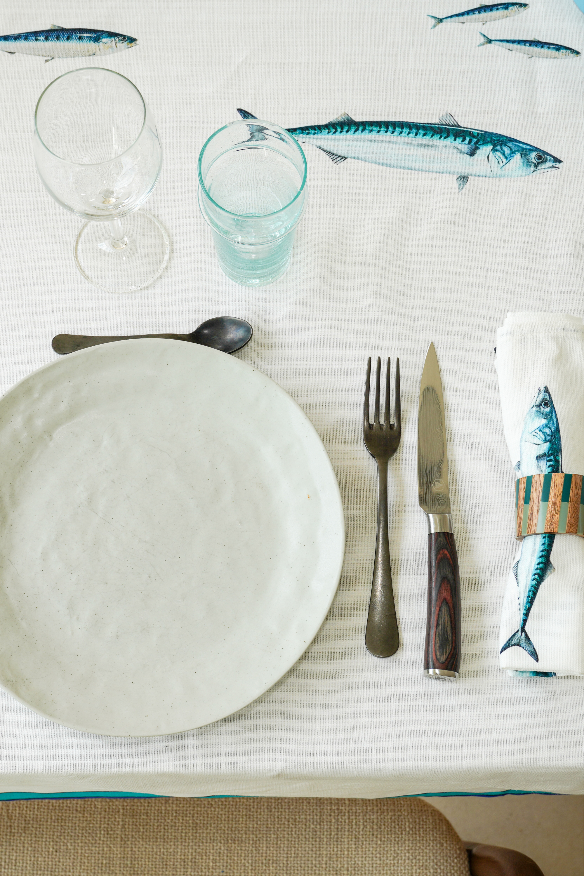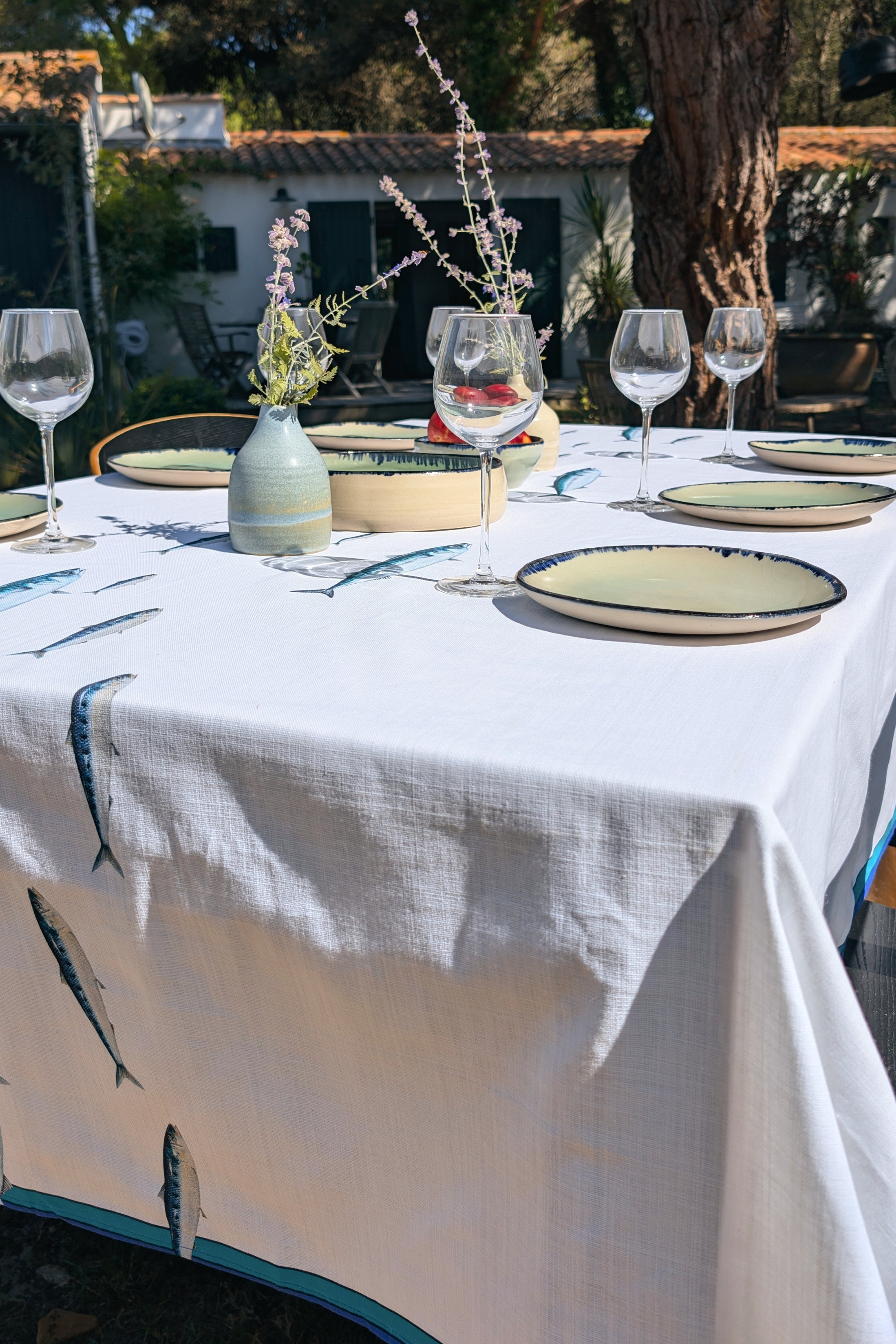 Cette nappe évoque notre désir de fraîcheur et d'air marin. Un banc de poissons composé de sardines et de maquereaux en guise de chemin de table s'harmonise avec les bordures colorées de la nappe. Le tissage en coton offre une texture et un motif qui allie sobriété et élégance. Grâce à ses teintes ton sur ton, elle s'utilise aisément avec une vaisselle moderne ou plus traditionnelle. Elle s'associe également très bien avec notre gamme de serviettes en coton natté pour parfaire une table haute en couleur.